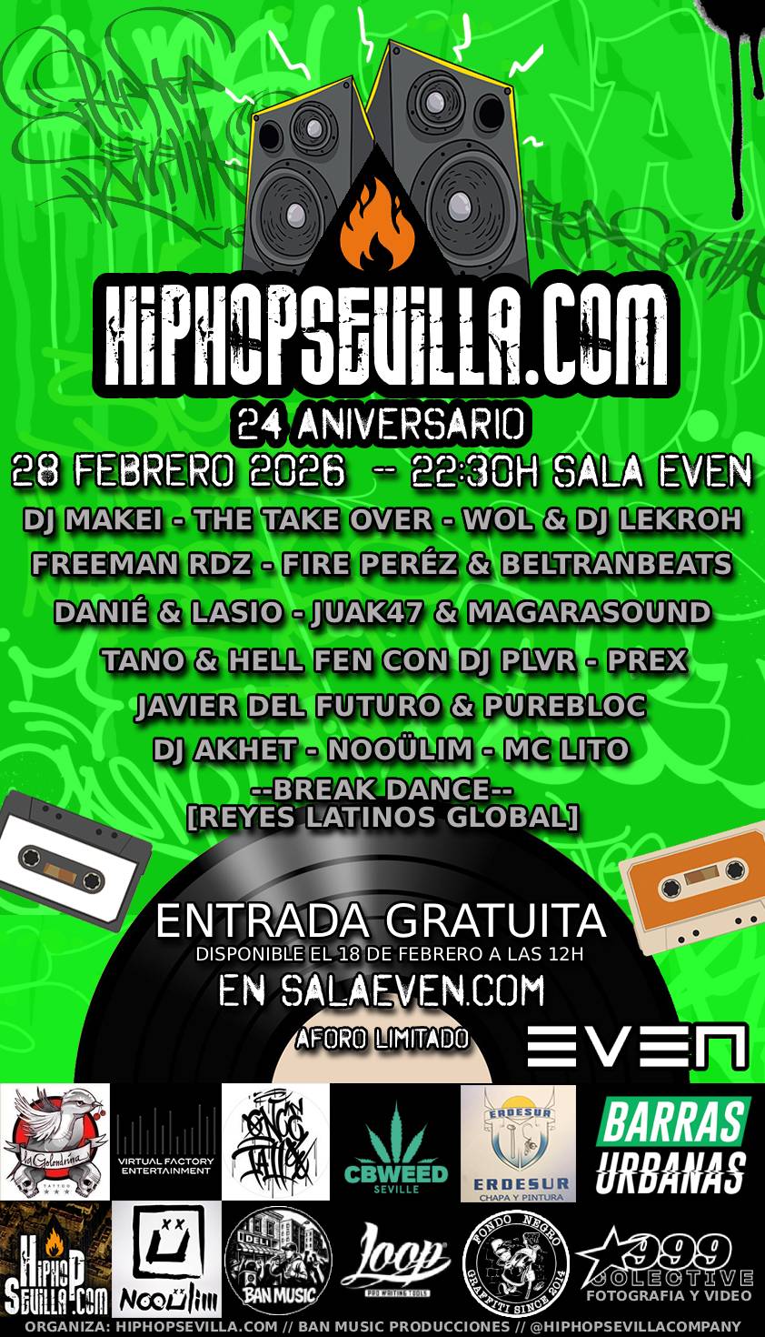 El proximo 28 de Febrero vuelve nuestro evento anual, cita indispensable en el calendario de eventos de HipHop de la ciudad, donde grupos de distintas epocas participan con conciertos en directo, break dance, graffiti….Entrada gratuita.